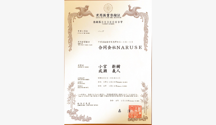 弊社が提供するハザードエコバッグMAPは物品の形状、構造、組み合わせについての考案を保護する実用新案に国から認可を受けています。
